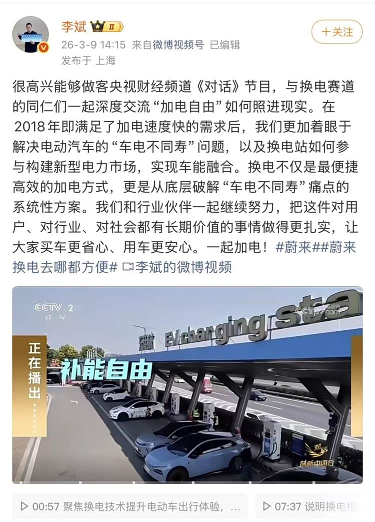 蔚来创始人李斌的话最引人瞩目,他在近日做客央视财经《对话·创新中国行》时,强调了“换电与超充并不矛盾,是不同场景的解决方案”。不过他也坦言,超充再好也快不过换电,而且超充用多了,会损害电池寿命、健康和长期安全性。