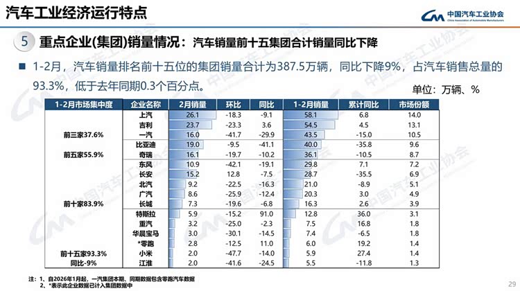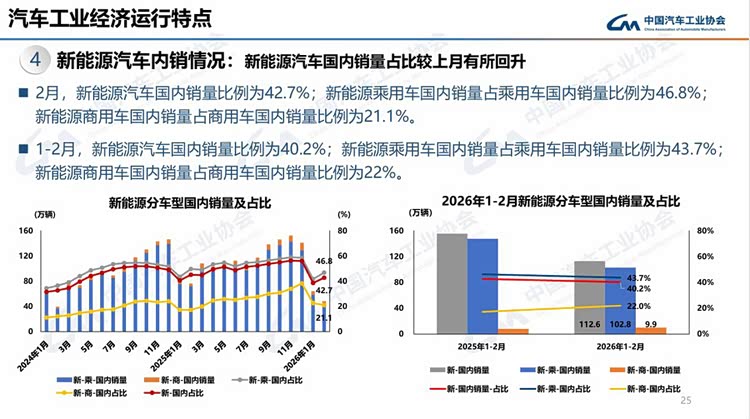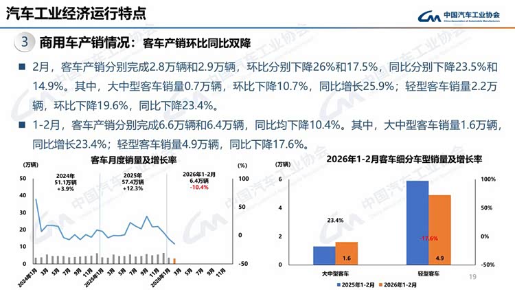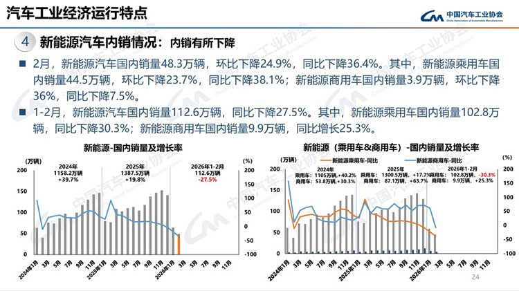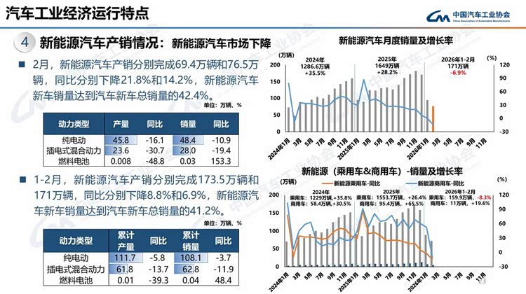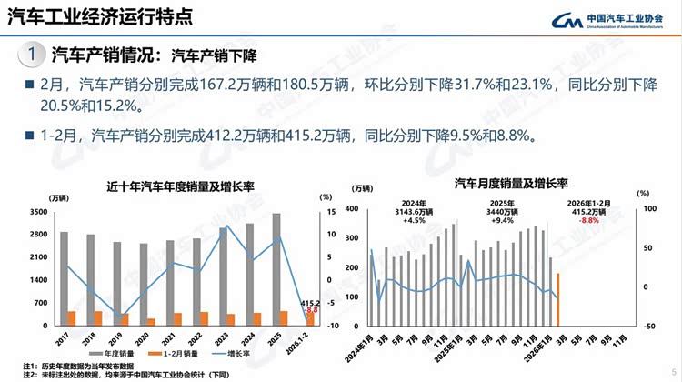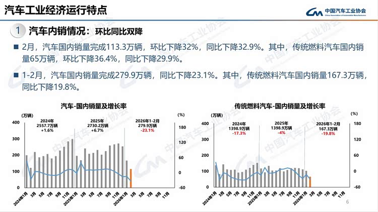 今年春节在2月中下旬,且假期有所延长,2月有效工作日仅16天,企业生产经营受到一定影响,市场活跃度总体有所下降。从1-2月行业运行情况看,汽车产销受政策切换调整、需求前置释放、春节假期错位、消费意愿不足、同期高基数等多重因素叠加影响,同比呈现下滑。