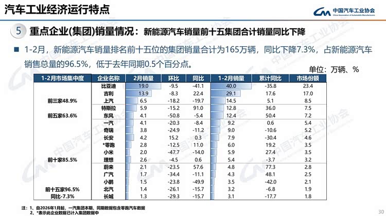 1-2月,汽车销量排名前十位的企业(集团)共销售348.4万辆,占汽车销售总量的83.9%。在汽车销量排名前十位企业中,与去年同期相比,上汽集团、吉利控股、东风公司、广汽集团和长城汽车销量呈不同程度增长,其他企业销量均呈不同程度下降。