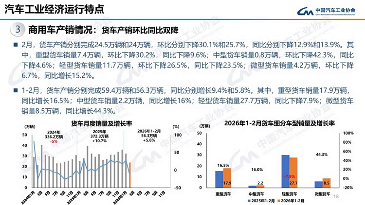 2月,商用车产销分别完成27.3万辆和26.9万辆,环比分别下降29.7%和24.9%,同比分别下降14.1%和14%。在商用车主要品种中,货车和客车产销环比、同比均呈两位数下降。