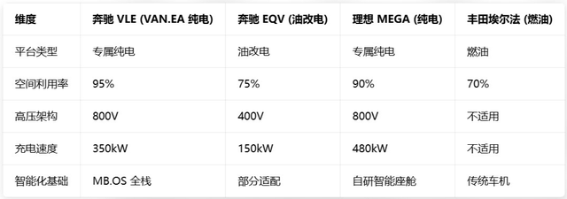 奔驰此前的 EQV 就是典型的 “油改电” 短板代表,空间挤、充电慢、智能化拉胯,而这次 VLE 的核心优势,就是奔驰为商用车 / MPV 专属开发的 VAN.EA 纯电平台,这也是它能叫板新势力的根本,三大硬实力直接碾压同级燃油 / 油改电车型: