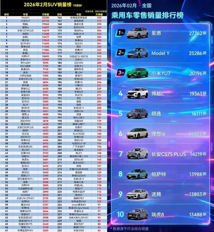 详细来看,小米YU7的2月销量为20196辆。放在SUV销量榜里,紧跟特斯拉ModelY(25286辆),领先第三名的吉利博越L(19363辆)一丢丢;放到全品类乘用车销量榜来看,小米YU7排在吉利星愿(27362辆)和特斯拉ModelY之后,位列第三。