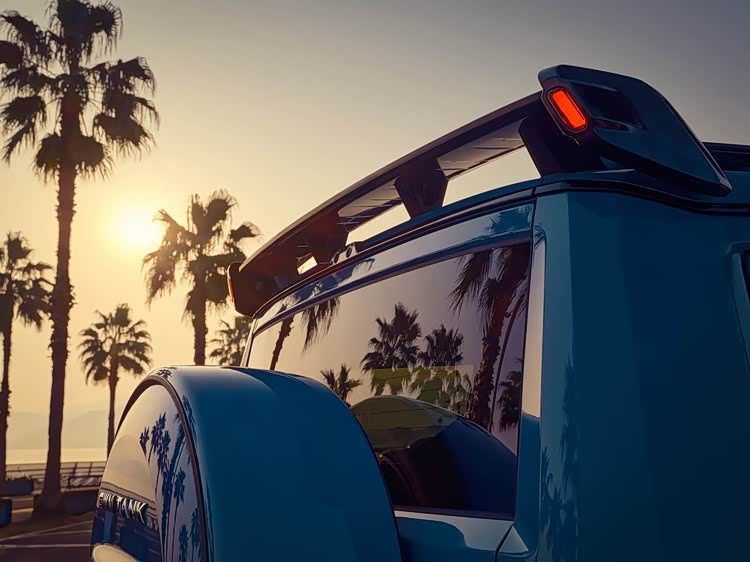 车身侧面轮眉宽厚,整体造型保持硬派越野风格。车顶配备了一颗激光雷达,预计将支持高阶辅助驾驶系统。尾部采用侧开式尾门,配有外挂式备胎和造型夸张的扰流板,运动感较强。