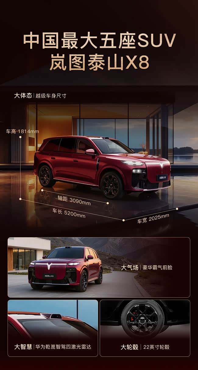 3月11日,岚图汽车董事长、党委书记卢放通过个人微博官宣,旗下全新车型 岚图泰山X8(参数|询价)即将登场,新车定于3月19日正式揭晓完整产品信息。作为岚图与华为深度合作的重磅力作,该车定位大五座SUV,主打“庭院级”舒适豪华大空间,将首搭华为全新一代智能座舱并首发多项黑科技,剑指高端大五座SUV市场,有望成为细分领域的革新之作,引发行业与消费者高度关注。