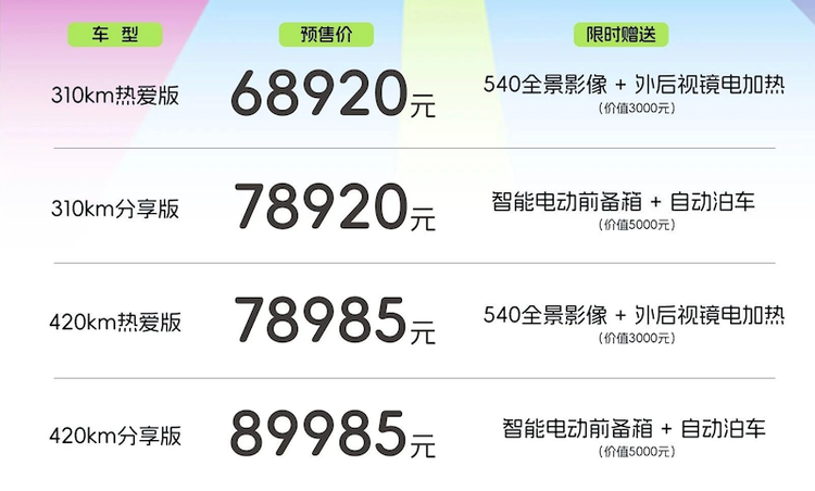 动力方面,后置后驱纯电动力系统,电机最大功率58kW/90kW,最大扭矩90N·m/115N·m。搭载29.48kWh、41.28kWh两款电池,CLTC纯电续航分别为310km和420km,快充30%-80%≤16.5min,还支持3.3kW/6.6kW外放电功能。此外,车辆还将配备后多连杆独立悬架,最小转弯半径5.2m。