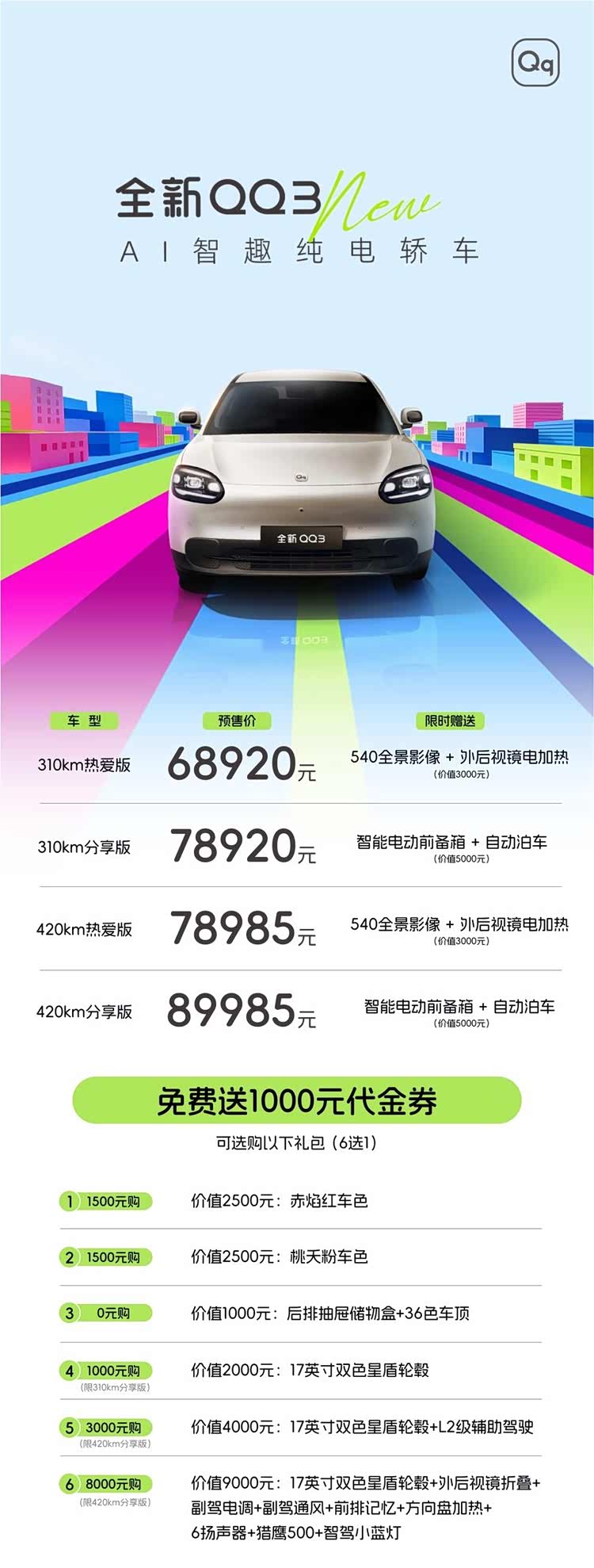 写在最后:从城市代步到川藏远行,从实用通勤到快乐出行,奇瑞全新QQ3在传承亲民基因的同时,实现产品力全面升级。而全新QQ3的预售价格也很亲民,值得考虑一下。