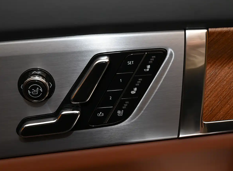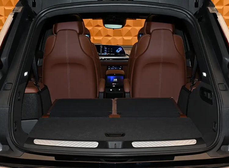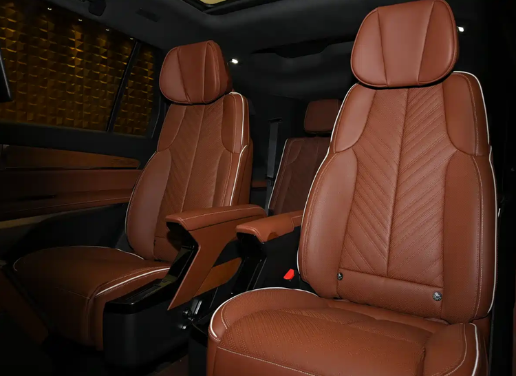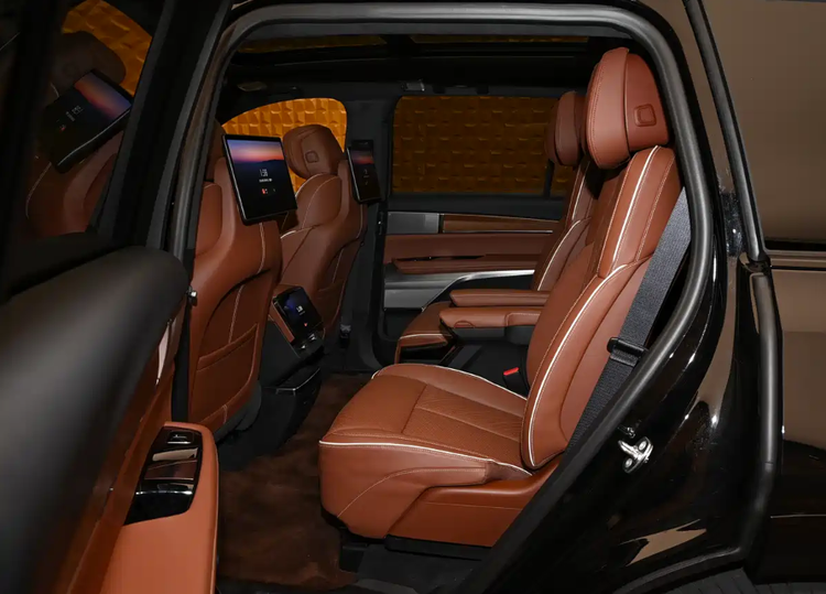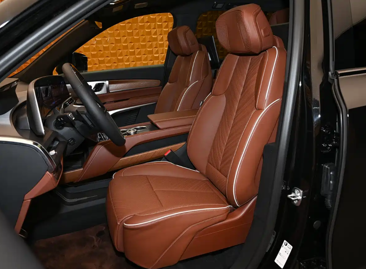 二排中央通道区域设有8英寸功能控制屏,座椅后方也提供独立娱乐屏,支持爱奇艺、QQ音乐等丰富应用生态。座椅延续了美式“大沙发”的宽大舒适风格,皮质纹理缝线与宽大的肩部、腰部支撑相结合,贯穿座椅的白色缝线进一步诠释了美式豪华质感。空间布局上,新车采用2+2+2六座形式,前排座椅标配加热、通风及按摩功能,配备五区空调控制系统。后备厢常规容积为430升,最大可扩展至2271升。