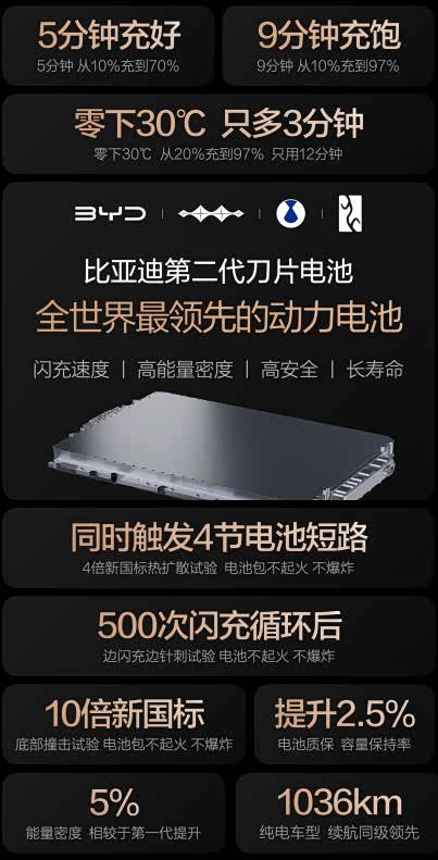 从第一代刀片电池捅破安全天花板,到第二代同时拿下闪充和寿命——电池大王还是那个电池大王。不玩虚的,只上硬菜。