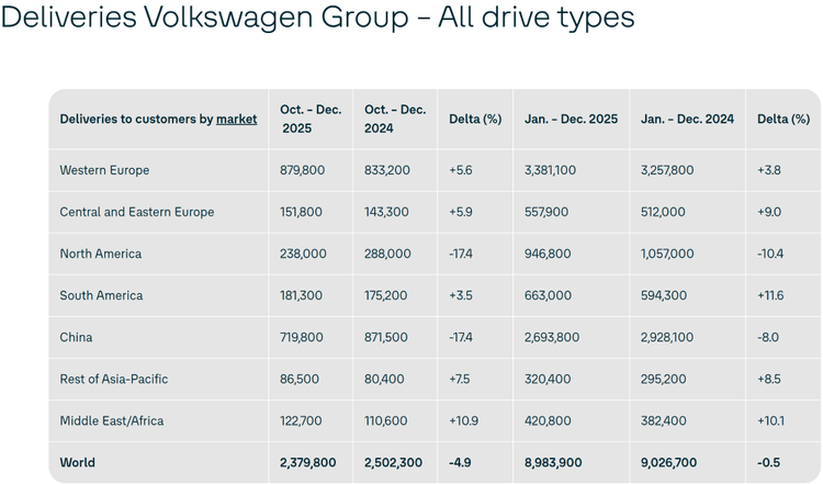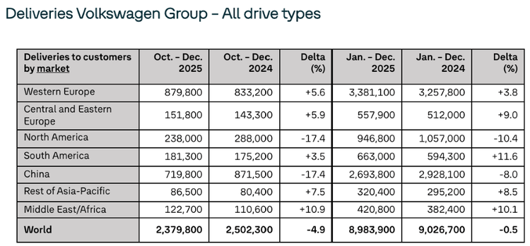 销量方面,大众集团2025年全球销量为898.4万辆,较2024年减少了4.3万辆,同比下降0.5%,其中在欧洲市场销量增长4.5%,其中在“大本营”德国增长5.6%,在南美市场销量大增11.6%,北美市场的销量则由于关税影响而下滑10.4%。