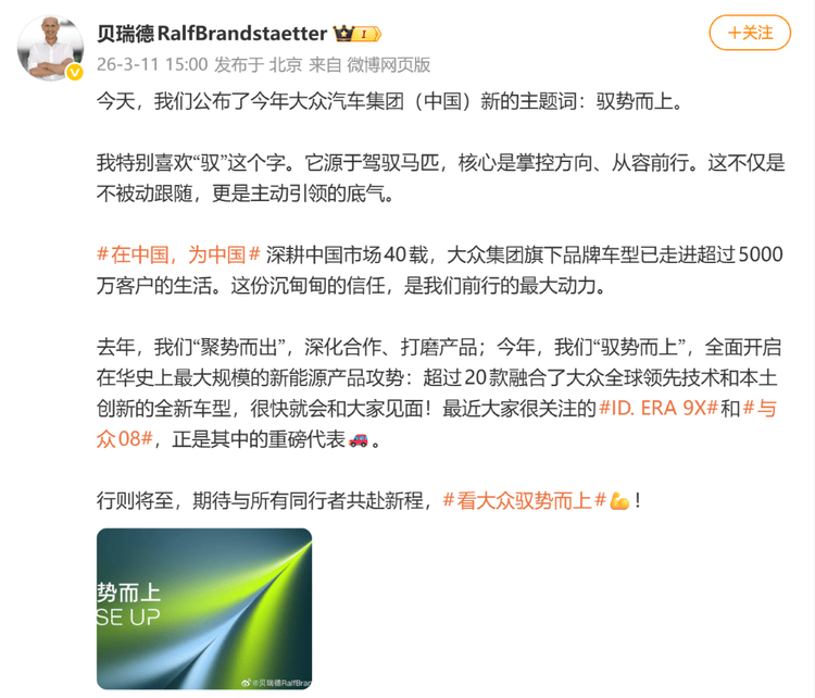 大众集团(中国)董事长兼首席执行官贝瑞德(RalfBrandstaetter)今日在社交媒体上发文,提到了ID. ERA 9X和 与众08(参数|询价)是大众超过20款新车攻势中的重磅车型代表。