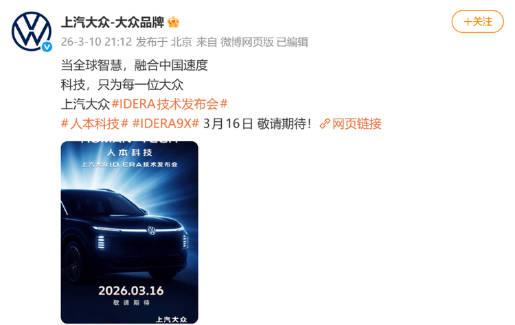上汽大众方面还已经官宣,将在3月16日举办IDERA技术发布会,届时将透露更多ID.ERA 9X相关的信息。