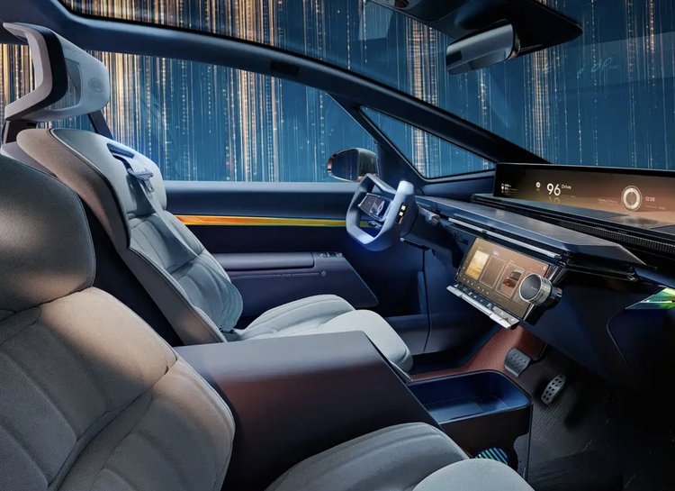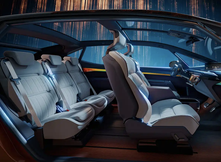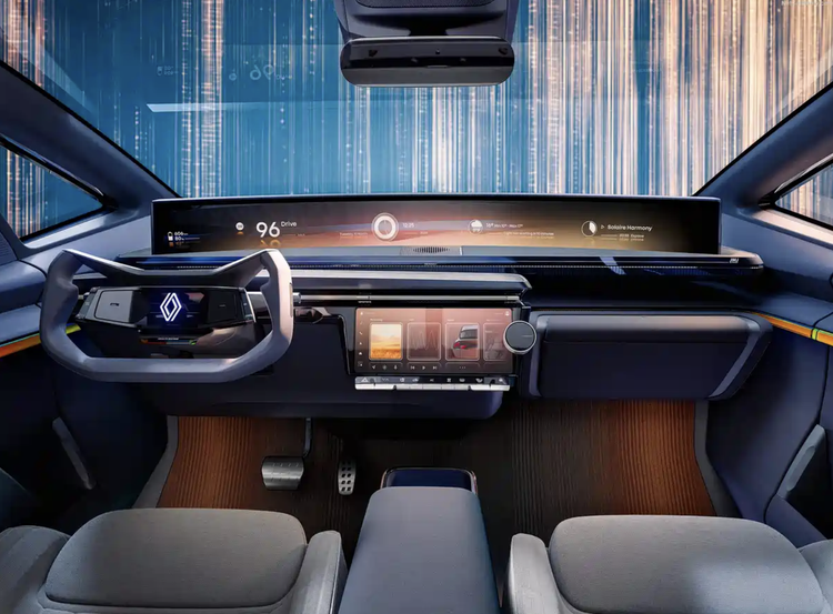 进入车内,雷诺R-Space Lab Concept采用了更多未来感的设计元素,也是雷诺想表达的是以人为本的理念。环抱式的中控台配备了异型多功能方向盘,方向盘中间加入了可发光的雷诺车标,两侧还配备了触摸感应式按键。中控台有一整块贯穿屏,涵盖了全液晶仪表、中控屏、副驾驶多媒体大屏,还加入了贯穿式空调出风口设计,下方还配备了一块辅助操控显示触摸屏,科技感很强。
