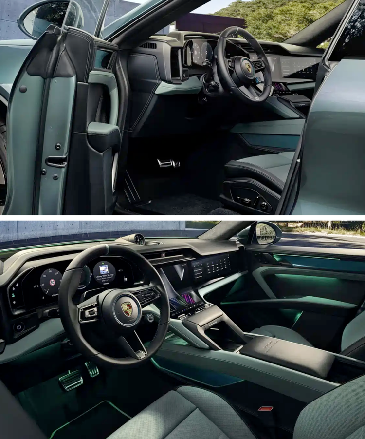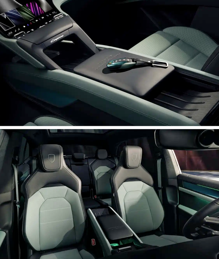 绿色装饰线条延伸至车门、方向盘、中控台等处,头枕刺绣保时捷盾徽、绿色缝线、铝制饰板等细节,进一步提升了座舱的豪华感与专属感。