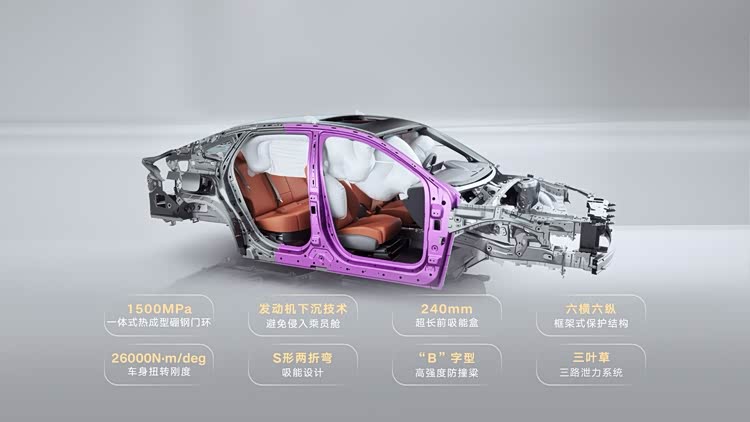 车身采用“星甲笼式”结构,高强度钢占比70%。A/B柱用1500MPa一体式热成型硼钢,每平方厘米能承受15吨压力。车顶能承受约11吨压力,远超国标。