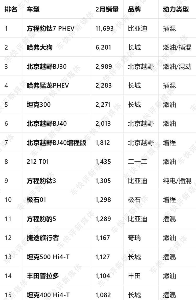 北京越野BJ30销量排名跟今年1月一样,依然还是第三销量为2989辆。意外的是1月位居方盒子SUV销量榜第四的捷途旅行者,今年2月销量仅为1167辆,同环比降幅都超过了70%。在方盒子SUV市场,已经跌出了前十。