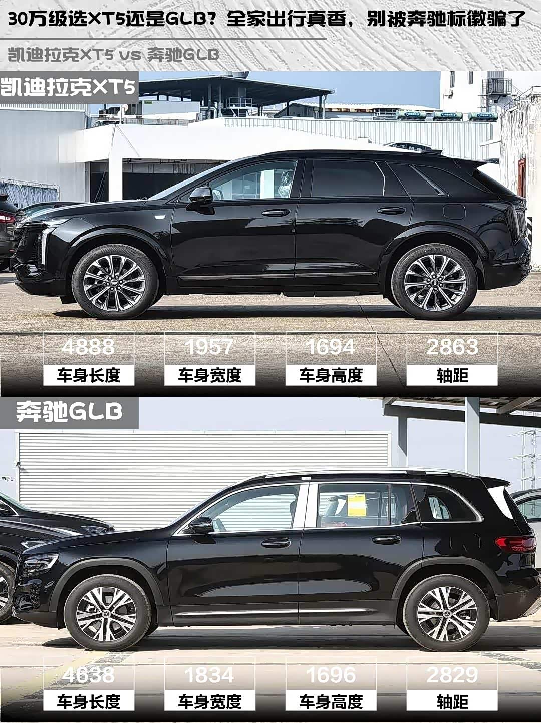 凯迪拉克XT5定位中型SUV,4888mm的车长比奔驰GLB长了整整250mm!实测后排能轻松跷二郎腿,后备箱容积653L起,放倒座椅后简直能当搬家货车用。而奔驰GLB虽然车长只有4638mm,但方盒子造型让头部空间更充裕,后备箱标准容积反而多出50L(703L),不过XT5的纯平后排地板对中间乘客更友好。