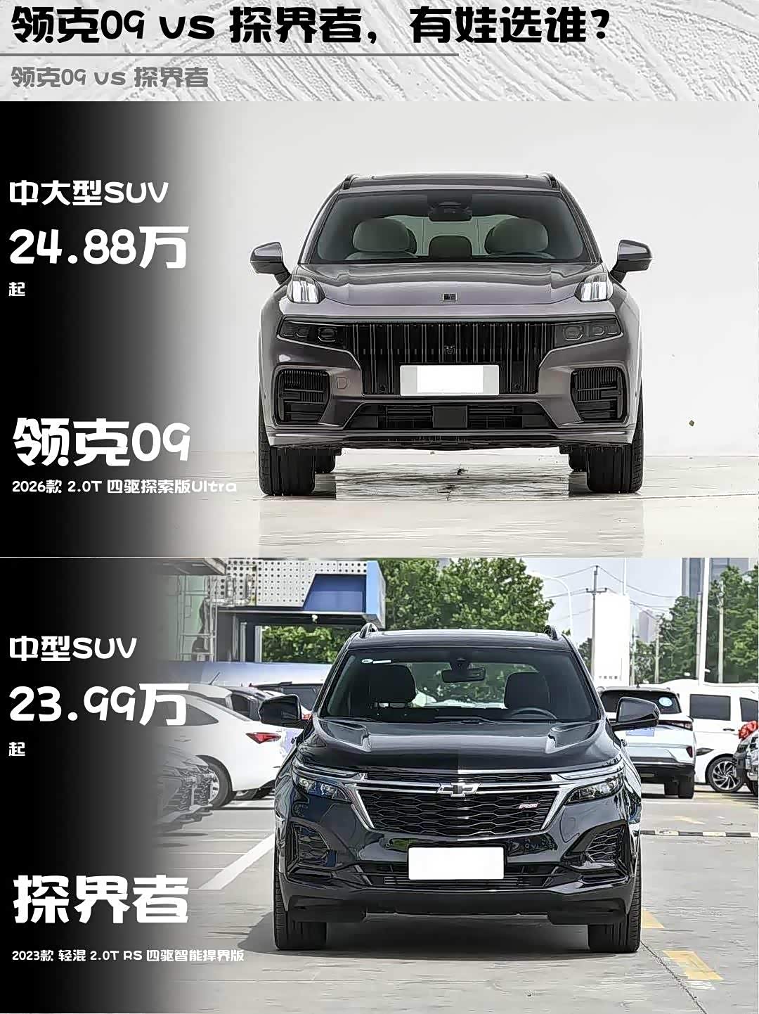 最近后台好多兄弟问我 领克09(参数|询价) 2026款 2.0T 四驱探索版Ultra和探界者2023款 轻混 2.0T RS 四驱智能捍界版怎么选?作为深度体验过两台车的车主,今天直接上干货对比!🔥