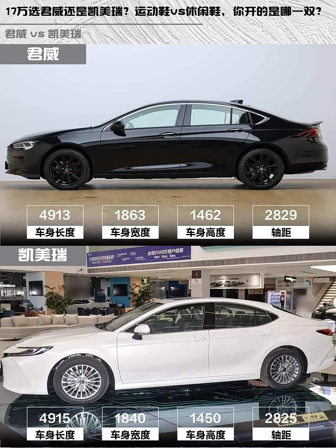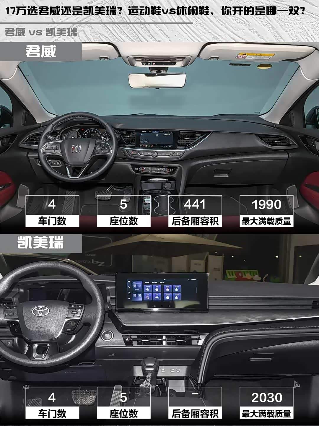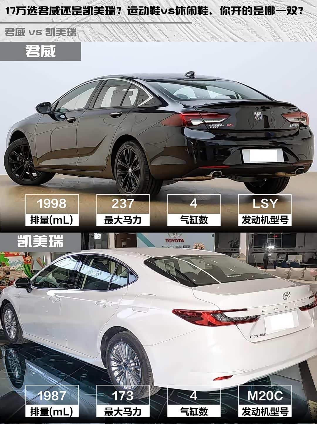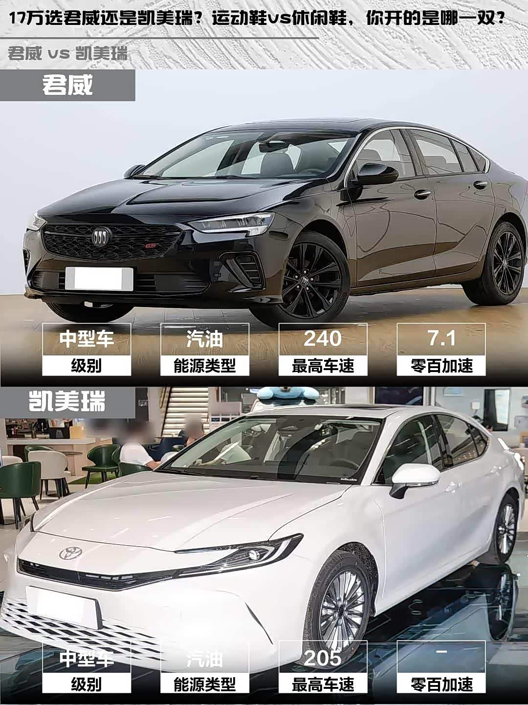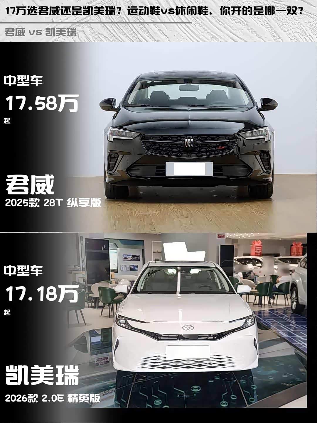 最近在选车的小伙伴看过来!今天给大家深度对比两款热门中型车—— 别克君威(参数|询价)2025款28T纵享版和丰田凯美瑞2026款2.0E精英版,都是17万价位段的实力选手,但性格完全不同哦!🔥