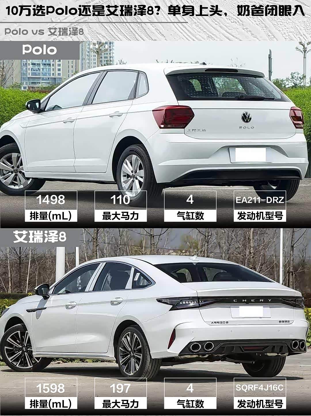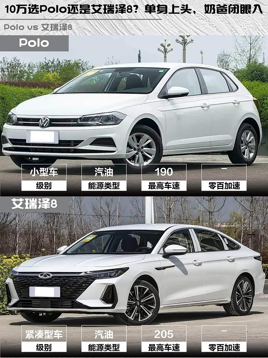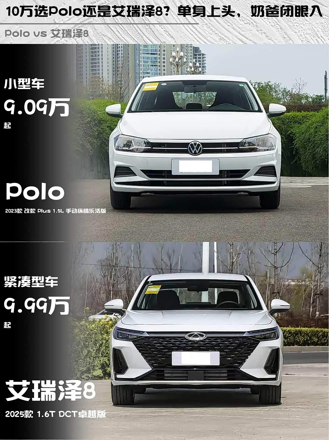 最近后台好多兄弟问我:预算10万左右,手动挡小车和国产家轿到底怎么选?今天直接拉出两款热门选手——Polo 2023款 改款 Plus 1.5L 手动纵情乐活版 vs 艾瑞泽8(参数|询价) 2025款 1.6T DCT卓越版,实测对比走起!🚗💨