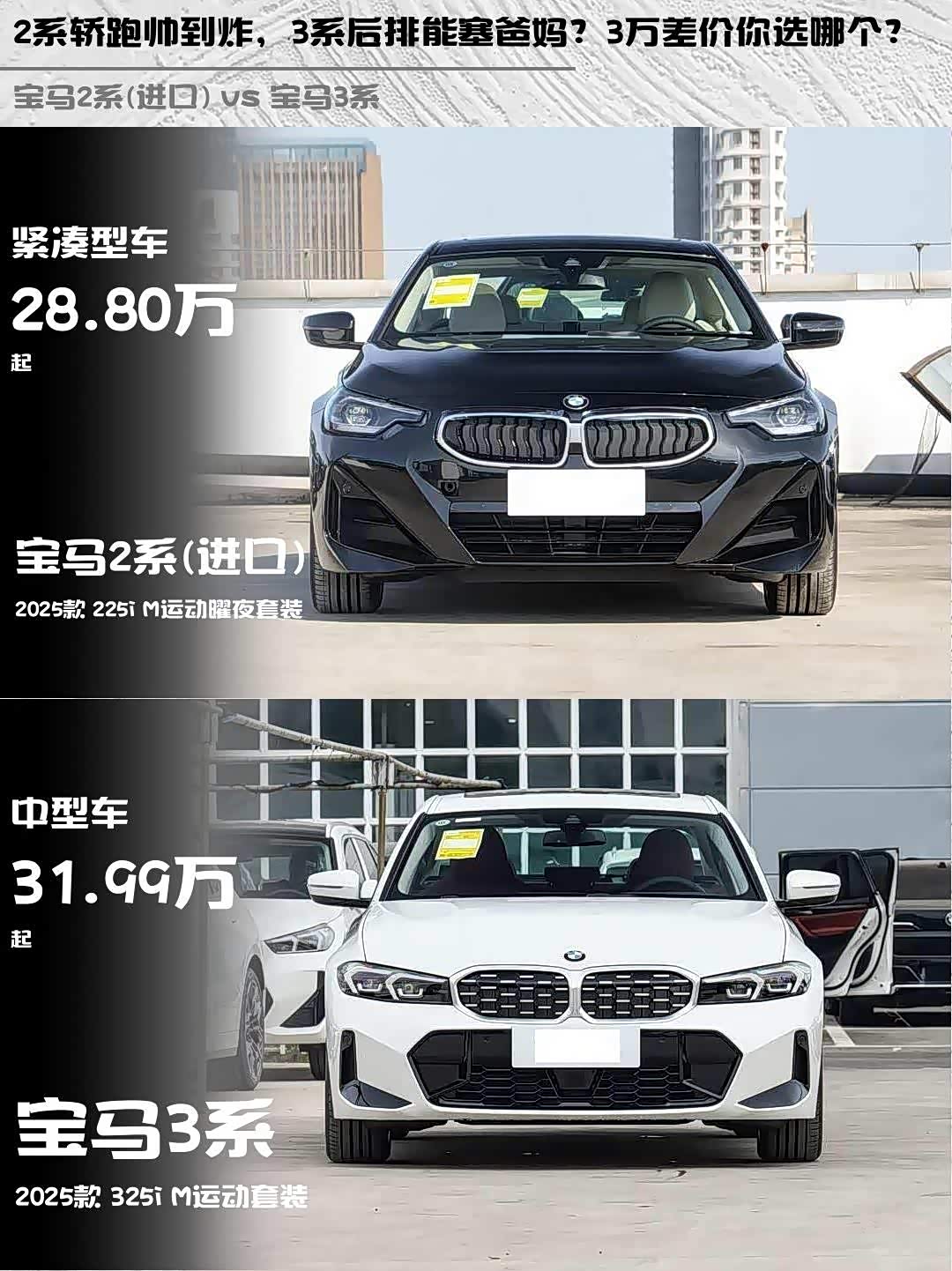 宝马2系(进口)(参数|询价) 2025款 225i M运动曜夜套装 vs 宝马3系 2025款 325i M运动套装,这两台车该怎么选?🤔 作为宝马家族里风格迥异的两款车,它们各自的特点真的太鲜明了!今天就来聊聊这两台车的真实体验对比~