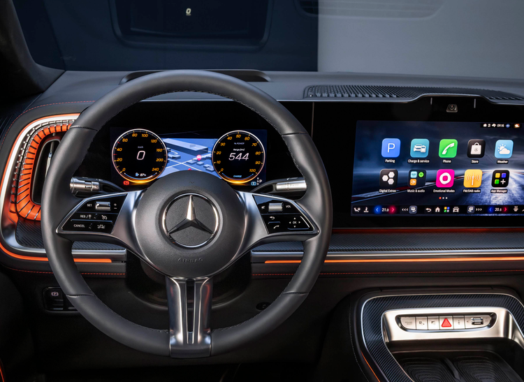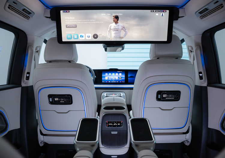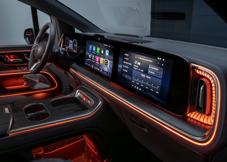 内饰方面,奔驰VLE的座舱采用了奔驰最新的家族化设计理念,由三块大屏幕拼接形成一整块大联屏,其中仪表盘尺寸10.25英寸、中控屏14英寸、副驾娱乐屏14英寸。不过屏幕之间存在较大的黑边,且副驾娱乐屏只出现在高配车型上,车辆支持选装AR-HUD抬头显示系统,将匹配奔驰自研的MB.OS架构。