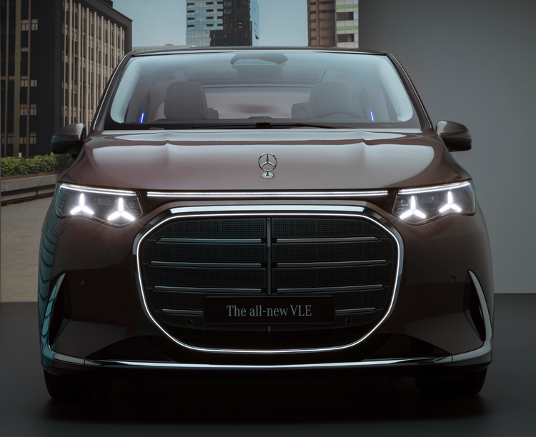 奔驰VLE在设计上高度延续了Vision V概念车的风格,前脸采用极具辨识度的环形大嘴格栅,内部辅以横幅式镀铬饰条,并提供“立标版”、“大标版”两种前脸可选。大灯内部融入了奔驰三叉星徽标设计元素,整体前脸视觉冲击力极强,神似张开嘴的“大白鲨”。