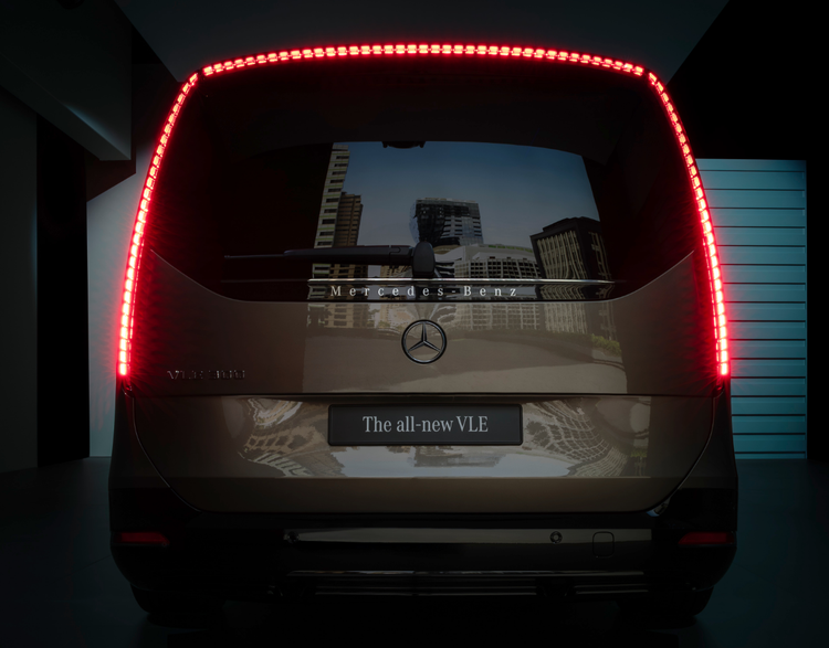 车尾轮廓较为圆润,配备大尺寸后风挡与修长的后雨刮器,后风挡支持单独开启,可更便捷地拿取后备厢物品。奔驰VLE的尾灯设计极具新意,竖向布局的灯组从车身两侧一直向上延伸至车顶,与高位刹车灯相连,整体形成连贯的“n”字形灯带,视觉效果极具辨识度。