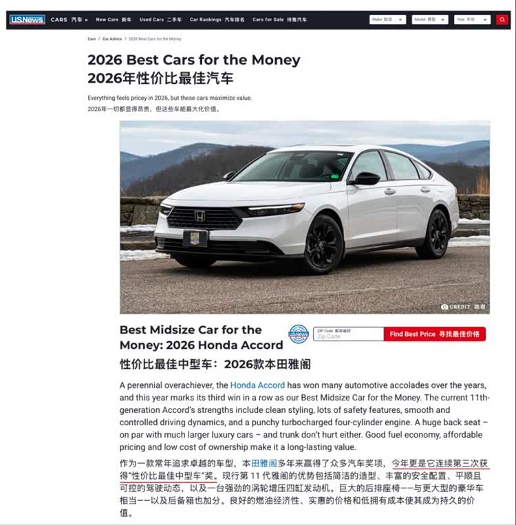 另外,在美国权威评测机构U.S. News & World Report最新年度榜单中,雅阁获得2026年度「最佳性价比车型」,这是雅阁连续三年蝉联中型轿车类别冠军。