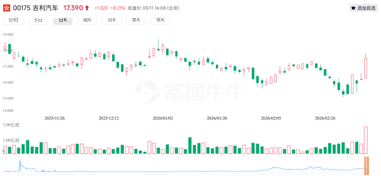 3月11日,港股收盘微跌,但吉利汽车(0175.HK)股价却飙升8.2%,报收17.39港元,领涨整个汽车板块。3月6日,该公司涨幅也曾触及8%。