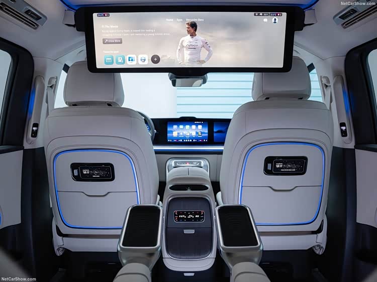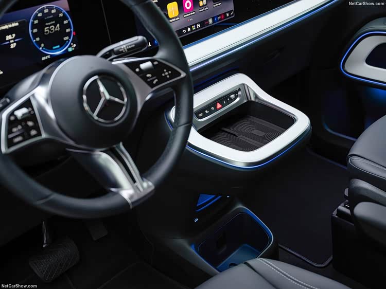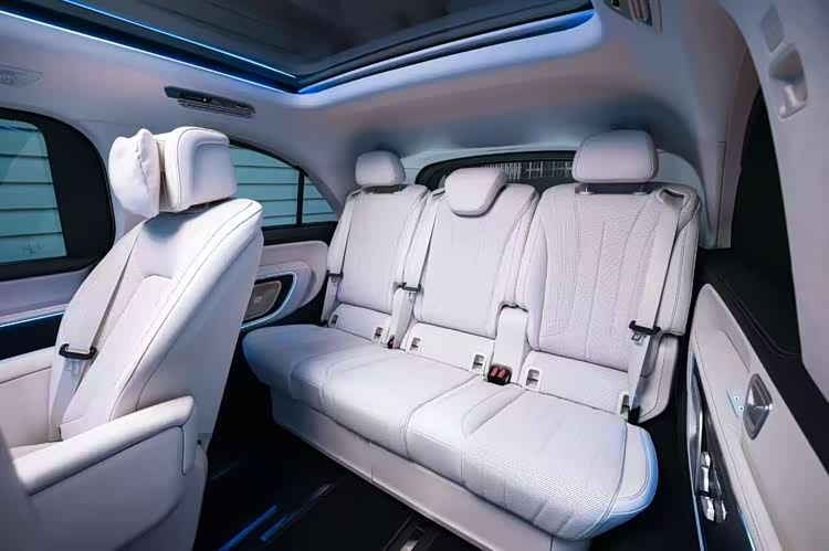 内饰延续奔驰新能源产品设计趋势,显得足够开阔,丰富的氛围灯效果也提升了层次感。在10.25英寸仪表屏、14英寸中控屏之外,可选装14英寸副驾屏和23.1英寸HUD,在第四代MBUX上融合多款AI大模型,只是屏幕黑边有些明显。
