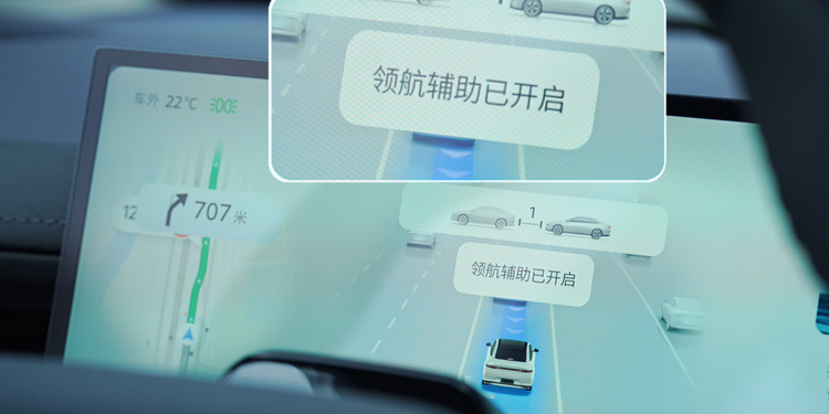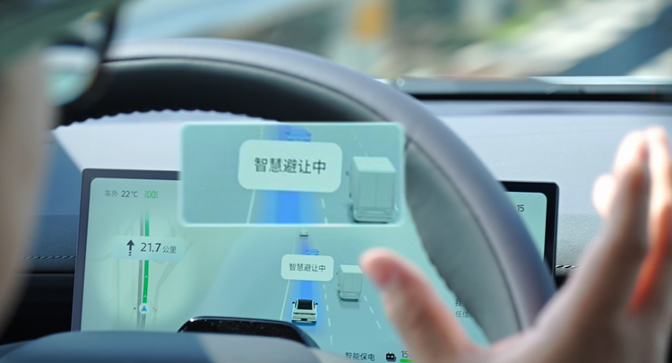 此外值得一提的是,在面对大货车时,这套系统又会相对谨慎一些,中控屏会实时显示“避让大货车”图标,车辆会微微向车道另一侧偏离,保持足够的安全距离后再果断超车,既不怂也不莽撞。