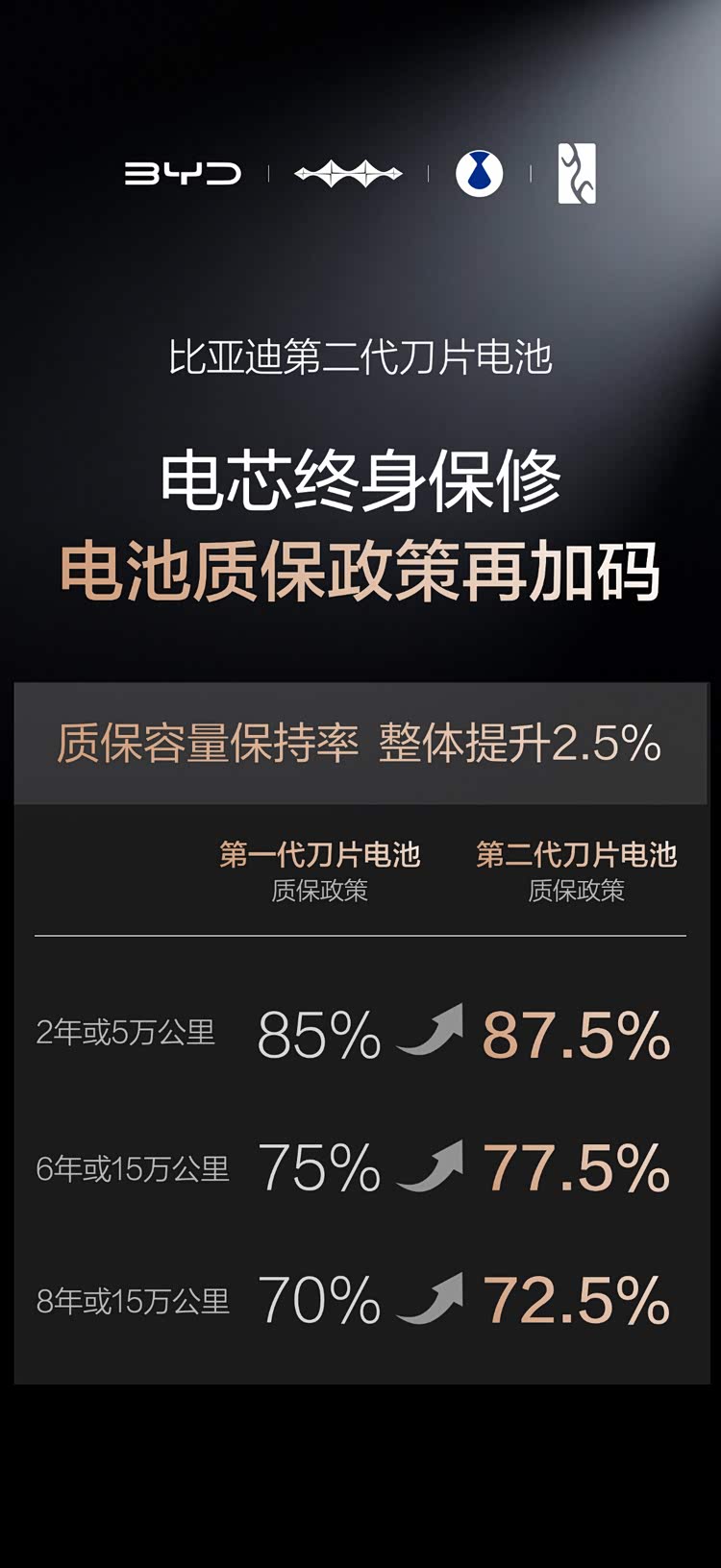 比亚迪的闪充呢,通过打造“锂离子高速通道”和“全温域智能热管理系统”,让闪充尽量少产热,而且让热量更快、更均匀地散出去,让闪充对电池寿命几乎没有影响,既充得快,又很耐用!正是因为对闪充技术有足够的信心底气,比亚迪宣布电池质保政策再加码!第二代刀片电池质保的“容量保持率”整体提升2.5%,电池容量低于77.5%就免费包换,电芯依旧是“终身保修”。
