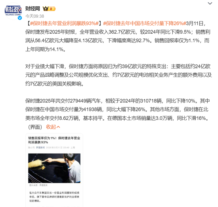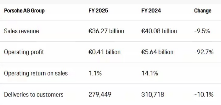 根据保时捷发布的2025年财报,全年营业收入362.7亿欧元,同比下滑9.5%;更令人心惊的是销售回报率从前一年的14.1%直线坠落至1.1%。