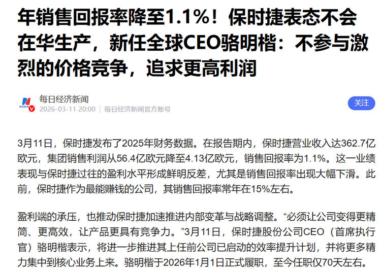 他甚至预测,2026年保时捷在华销量将进一步下滑至3万辆 。这种主动“缩量”的操作,在传统商业逻辑中堪称反直觉。这不禁让人疑虑,其宁可忍受规模萎缩,也要保全那份来自斯图加特的血统?