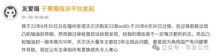 事实上,沃尔沃凸轮轴故障并非新问题。车友公社搜索发现,早在2025年12月,网络上就有该故障爆发的相关信息,指出故障主要涉及2022款至2026款搭载轻混B系列发动机的S90、S60、XC60等主力车型。其中,2022款至2024款车型问题多集中在出保前后,而2025款至2026款新车故障爆发时间大幅提前,呈现明显的批次性缺陷特征。在黑猫投诉上,反映这一问题的消费者不在少数。