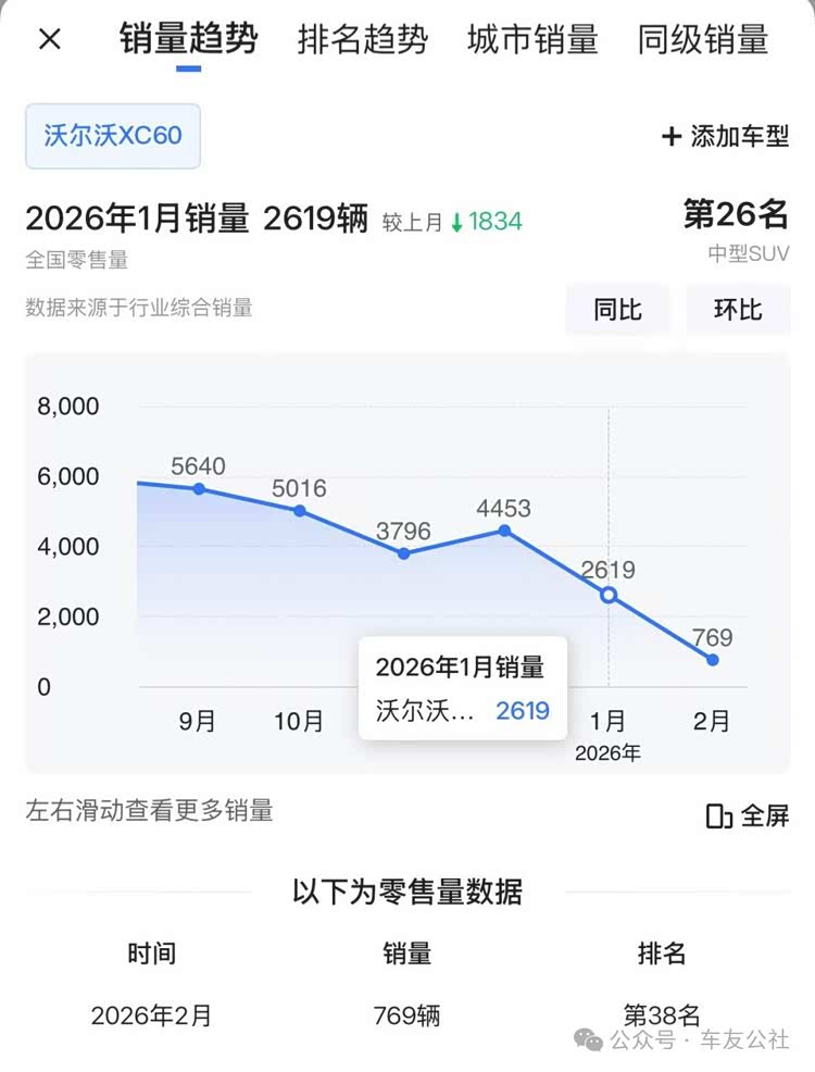 车友公社搜索数据发现,沃尔沃XC60全国零售量自2025年6月历史高点7179辆逐月下滑,2026年1月已降至2619辆,降幅达63.5%。瑞典本土市场也受影响,2026年1月沃尔沃XC60销量同比大跌54.8%。业内分析指出,“安全”是沃尔沃的核心品牌标签,而核心部件频发故障且处理敷衍,正在严重透支消费者信任。