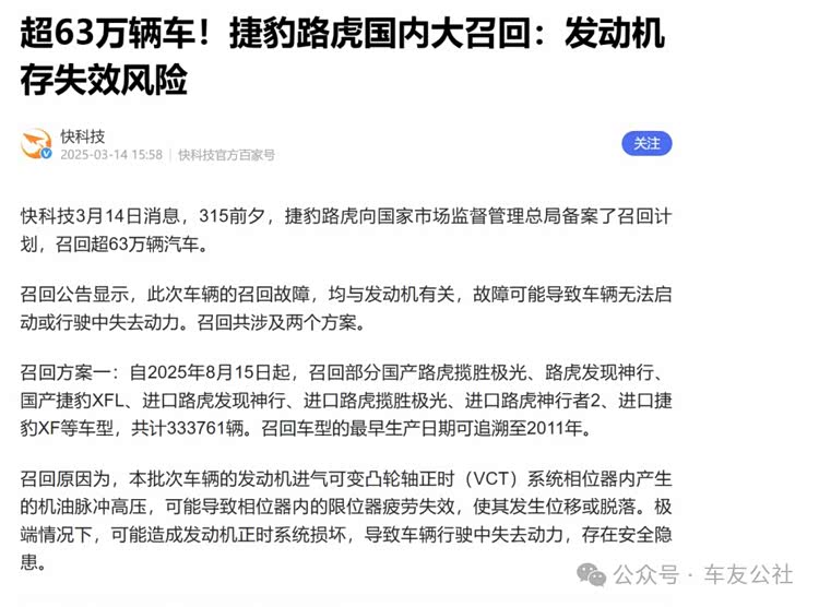 (2025年捷豹路虎关于凸轮轴故障问题的召回公告)