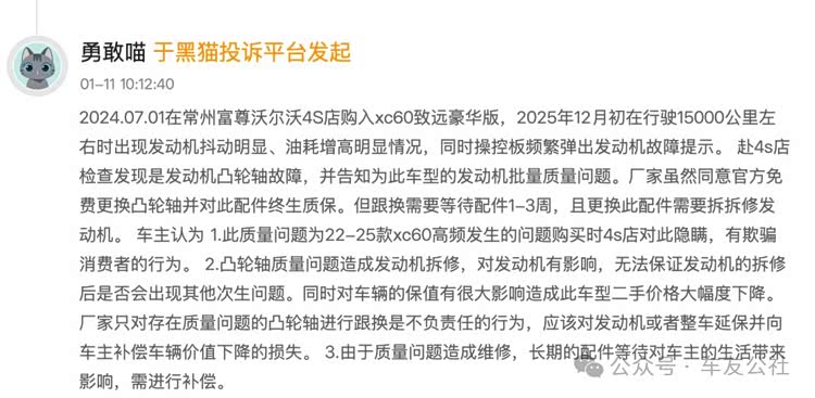 “才开2万公里的准新车,发动机故障灯反复亮,4S店说要拆发动机换凸轮轴,不仅没有任何补偿,还告诉我这是厂家最终方案!”北京车主陈先生(化名)提起自己的2025款沃尔沃XC60,满是无奈与气愤。