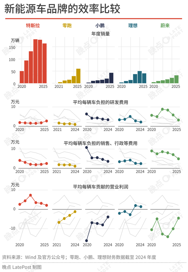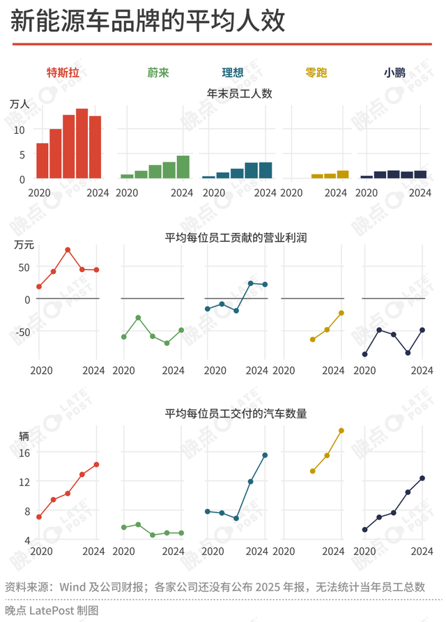从 2020 年到 2024 年五年间,蔚来员工规模从约 7500 人增加到 4.56 万人,同期销量从 4.3 万辆增长至 22.2 万辆,蔚来单名员工对应销量基本维持在 5 辆左右,销售效率并没有随着品牌成长而提升。