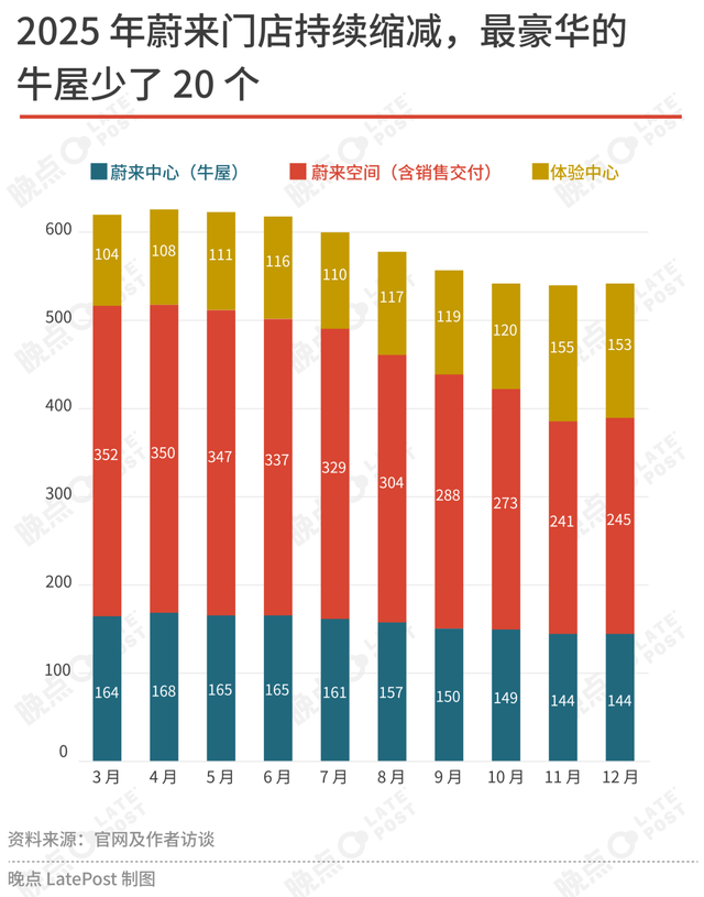 2025 年 9 月,蔚来连续关闭位于广州 CBD 珠江新城、梅花园的两家牛屋,位于广州乐峰的牛屋被调整为蔚来空间。这一年蔚来门店总量整体缩减,位置相对不核心的体验中心在增长,其他门店都在减少。缩减之后,蔚来和乐道门店 2025 年平均一个月一家店只卖出 28 辆车,是理想的一半,特斯拉的四分之一。