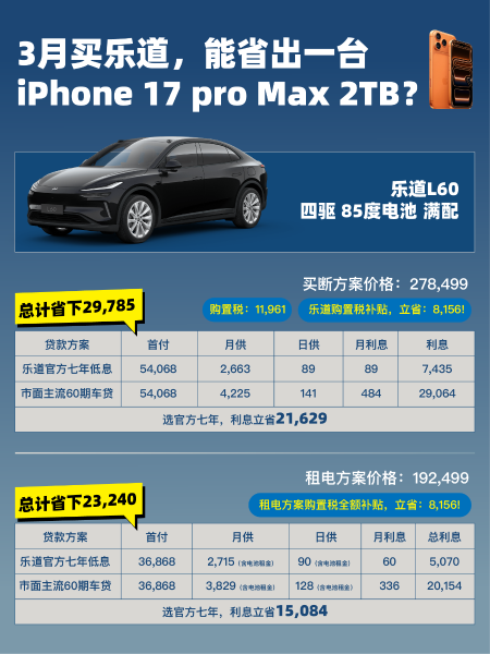 如果说产品力是敲门砖,那么购车门槛的降低则是乐道瓦解合资品牌护城河的“杀手锏”。针对丰田、大众老车主置换时最关心的“现金流”与“持有成本”,乐道在3月推出了极具杀伤力的金融组合拳:七年超低息方案年化费率低至0.49%,首付仅需28709元,日均还款67元,叠加购置税全兜底,乐道L60最高可以省出8156元,相当于一台iPhone 17 pro Max 2TB。