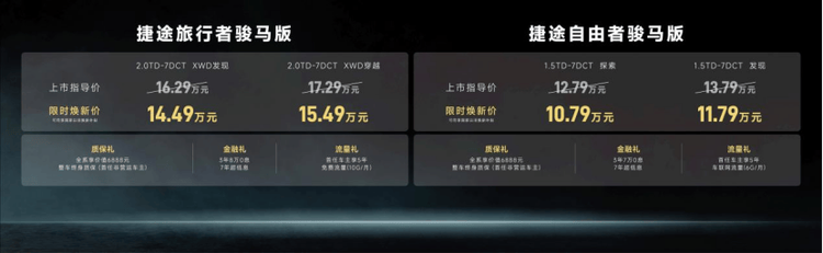 此次上市的捷途旅行者骏马版共推出2个版型,官方指导价16.29万元-17.29万元,购车即享3重上市权益,限时焕新价14.49万元-15.49万元。捷途自由者骏马版共推出2个版型,官方指导价12.79万元-13.79万元,购车即享3重上市权益,限时焕新价10.79万元-11.79万元。双车兼顾不同用户的预算与需求,限时焕新价进一步拉低硬派方盒子的入手门槛,让更多人能轻松拥有个性化越野座驾。