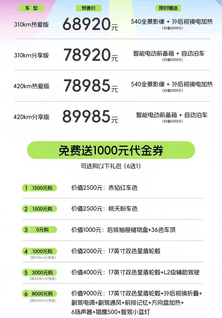 3月10日,全新奇瑞QQ3正式开启预售。新车共推出4款配置,预售价68,920-89,985元,预售期间下订可得1000元代金券,可在选购6种选装礼包抵扣现金,同时,配置较高的分享版车型还将额外赠送智能电动前备箱+自动泊车功能,热爱版车型将额外赠送540全景影像+外后视镜电加热两项配置。