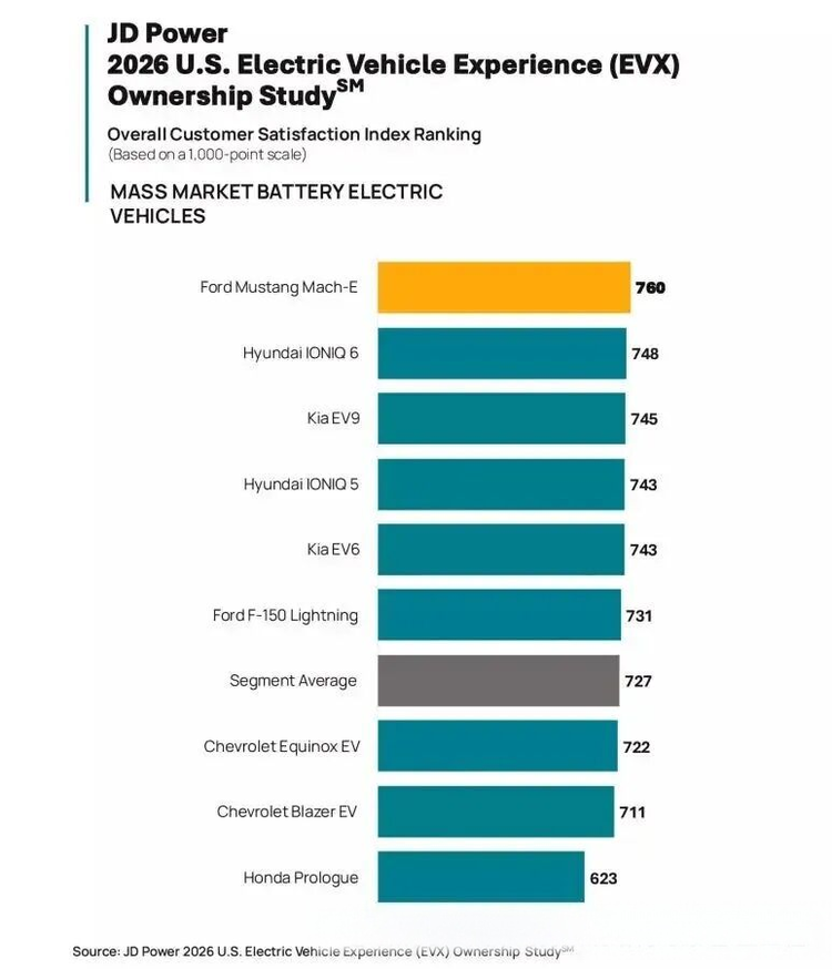 在大众市场部分,竞争同样呈现出两极分化的态势。福特 Mustang Mach-E(参数|询价)以760分的成绩位居榜首,现代Ioniq 6(748分)、起亚EV9(745分)紧随其后,成为大众市场中表现较好的车型组合。其中,起亚EV9能够跻身前三,与其接入特斯拉超级充电网络、实现充电桩数量翻倍的举措密切相关,有效提升了用户的补能体验。而雪佛兰Blazer EV(711分)、本田Prologue(623分)则表现相对不佳,尤其是本田Prologue,分数明显低于行业平均水平,在大众市场中处于下游位置。