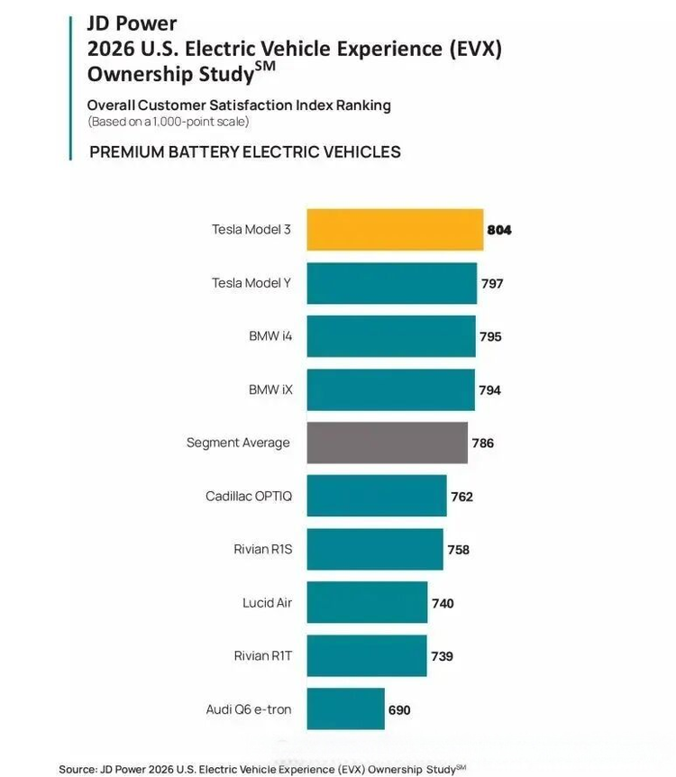 近日,权威市场调研机构JD Power发布2026年美国电动车拥有经验研究报告,这份覆盖全细分市场的调研数据,不仅刷新了电动汽车满意度的历史纪录,更清晰勾勒出当前电动车市场的竞争格局与消费趋势。其中,特斯拉Model 3与Model Y在高端市场表现突出,分列满意度冠亚军,整体电动车满意度创下789分的历史新高,96%的车主明确表示下一辆车仍会考虑电动车,这一数据表明电动车已逐步摆脱初期质量争议,进入以用户体验为的成熟发展阶段。