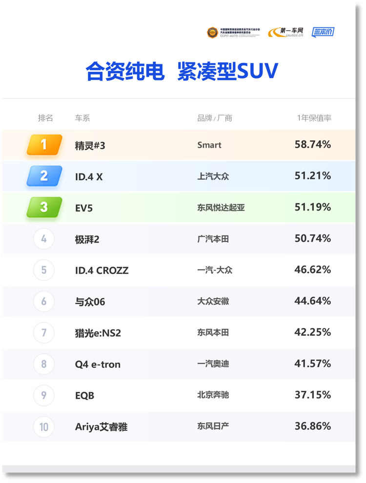 2026年开年,国内新能源汽车市场的竞争已然进入白热化阶段,纯电车型凭借智能化体验、低用车成本持续抢占市场份额,而紧凑型SUV细分市场,凭借贴合都市通勤、家庭首购的核心需求,成为合资品牌纯电赛道的核心角逐区。新车端,各大合资品牌持续加码纯电技术落地,从续航安全、空间设计到智能交互全面升级,不断刷新主流消费市场的体验上限;二手车端,随着新能源二手车流通体系日趋完善,消费者对纯电车型的长期价值关注度持续攀升,保值率早已从购车的附加参考项,升级为衡量纯电车型综合实力、品牌口碑与用户认可度的核心硬通货。2026年1月,中国国际贸易促进委员会汽车行业分会汽车金融暨保值率研究委员会&第一车网蓝本价正式发布2026年1月保值率排行榜。在合资纯电紧凑型SUV细分榜单中,Smart精灵#3、ID.4 X、EV5、极湃2、 ID.4 CROZZ(参数|询价)等热门车型悉数上榜,它们以差异化的产品优势站稳纯电细分赛道,而保值率的排名,正是市场与消费者对车型长期价值的最直观投票。