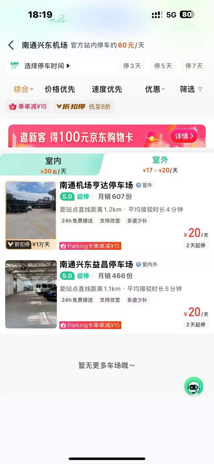 南通兴东机场官方停车场24小时最高收40元,长时间停车费用不低。别发愁,省钱有招!微信搜【小强停车】,预约周边停车场,输入邀请码“58”,可领38元停车抵扣券。用小强停车预订,机场附近停车场一天17元起,实惠又便捷。春节自驾去机场的车主,不妨试试这个省钱妙招!