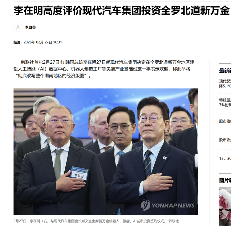 “(韩国总统)李在明高度评价现代汽车集团投资全罗北道新万金”,并称此举将“彻底改写整个湖南地区的经济版图”。