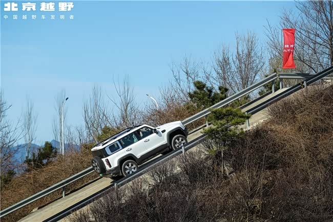 如果说生产线展示的是制造实力,那么工厂里的越野性能展示区,则让“越野”变得更加生动。发动机的轰鸣声中,BJ40、BJ60依次挑战交叉轴、涉水路以及45度陡坡等复杂地形。站在场地边缘观看,车辆在极限角度下缓慢攀爬的画面,依然让人不由自主屏住呼吸。