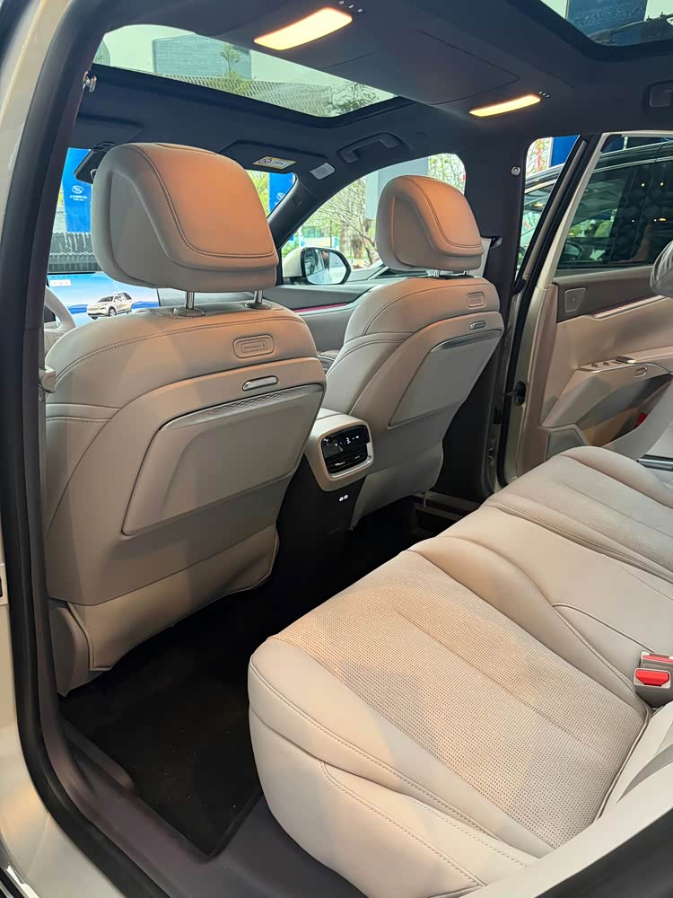 内饰基本延续了至境L7的家族化设计语言。简洁的环抱式座舱内配备15.6英寸悬浮大屏和10.25英寸矩形仪表屏,加之AR HUD抬头显示,营造出科技氛围,并搭载高通8775智舱芯片,支持豆包Al语音助手。而大量皮质包覆配合环绕式氛围灯,继续强调豪华感,并换装了全新平底三幅式多功能方向盘+电子怀挡,重新设计的镂空副仪表台上配备一排镀铬物理按键、手机无线快充等。